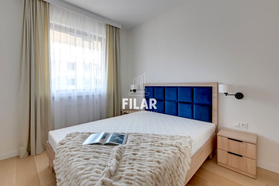 The property is located on the second floor and with its area of 42 m2 comprises: living room with kitchenette, bedroom, bathroom with toilet and hallway. The flat has been arranged in a colour scheme of white and light wood broken by deep blue. This elegant combination evokes a sandy beach and a maritime horizon. The heart of the flat offers a large, comfortable corner sofa and a TV with a practical cabinet. The kitchenette with white furniture is equipped with the necessary appliances and provides a comfortable worktop serving as a dining table complemented by two chairs. The bedroom comprises a large double bed with a soft navy blue headboard, practical bedside tables and a roomy built-in wardrobe in a consistent colour scheme. The bathroom is equipped with a shower cubicle, washing machine, toilet, washbasin with functional cabinet and illuminated mirror. The flat is brand new, previously unoccupied. It will be ideal for a single or a couple.