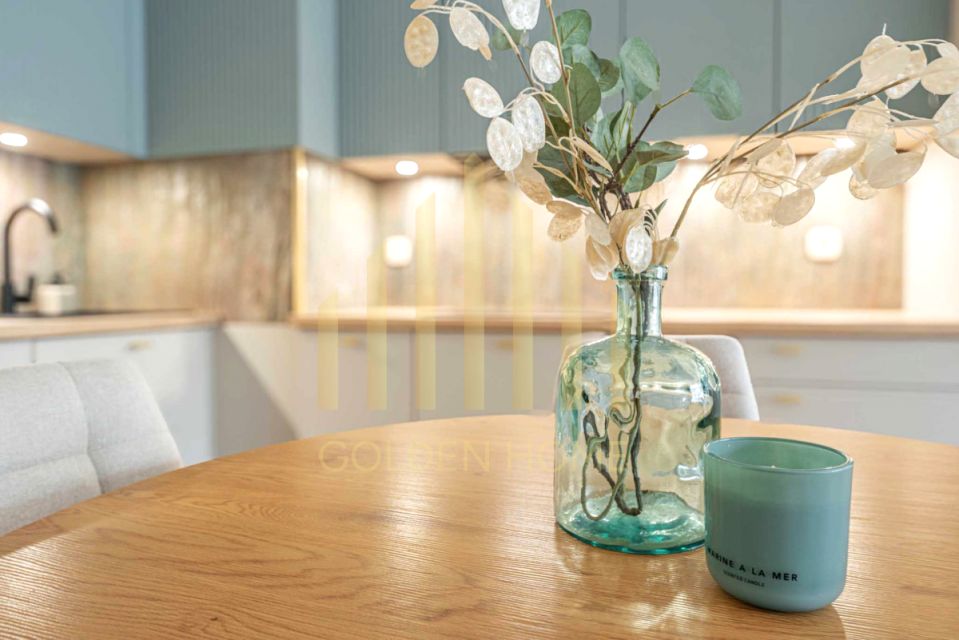 The apartment has been finished with the utmost care, using the best materials available on the market. The bathroom features both a bathtub and a shower cabin, as well as a bidet, with Villeroy&Boch ceramics and large Italian tiles. The spacious living room with a large kitchenette is equipped with modern appliances and elegant furniture. Two comfortable bedrooms offer large beds and spacious wardrobes, and the refined flooring is laid in an elegant herringbone pattern.